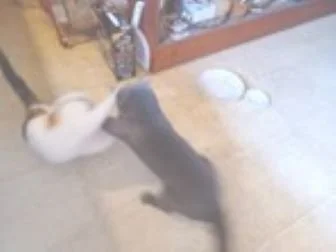 The fights come just before meals. When the kitties hear food being prepared they charge the kitchen ready for battle and set to whacking each other. "ladies, ladies, ladies", I say to them, "What's all this about. There's plenty for both of you". They stop and stare. As soon as I turn my back to finish preparing the meal the brawl starts again.