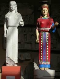 Pinted Ladies: Some will be surprised to learn that the classic white statues of antiquity were originally painted in full color. Imagine the gleaming marble art of Praxiteles outraged by gratuitous "natural" color. No, no, no, impossible! The closest modern equivalent would be figures in a wax-museum.