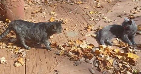 Gray lay still when Jack walked up to her. It was a good sign. Calico was watching from the railing nearby. All three rummaged about the leaves for a time, then returned inside for the morning meal. I imagined they were busy sorting through their first impressions. More likely they were thinking about the upcoming meal.